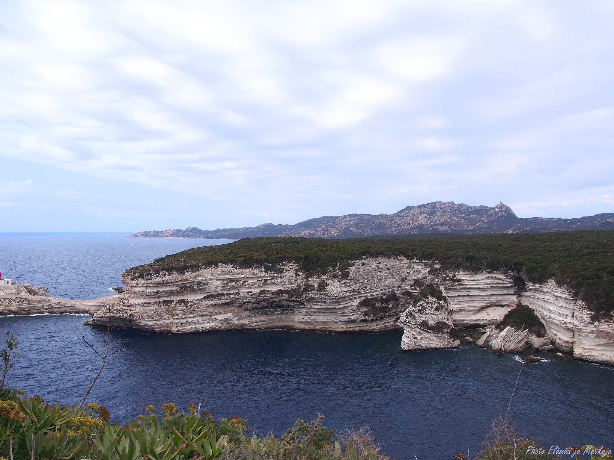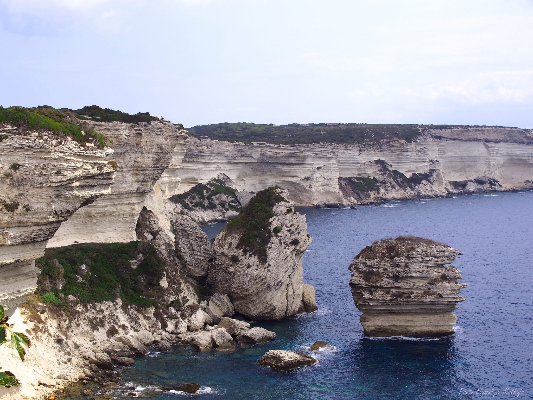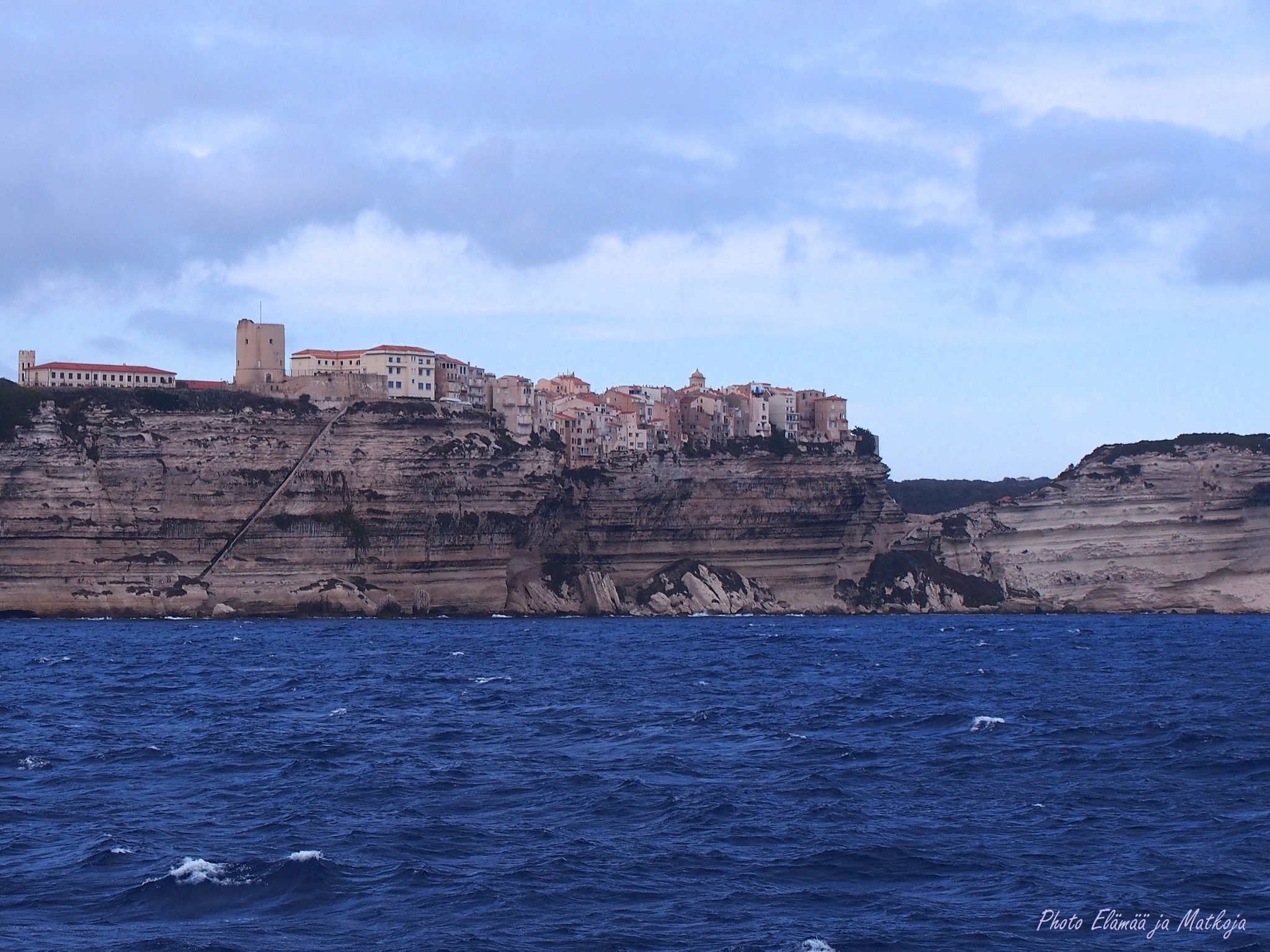 Pitkä matkapäivä on kääntymässä iltaan, näen edessäni Korsikan tuulen ja veden uurtamat vaaleat kalkkikivikalliot. Meri on kovertanut kallionkielekkeen alaosan ja siellä jyrkänteen reunalla kohoavat talot ovat kuin tyhjän päällä.