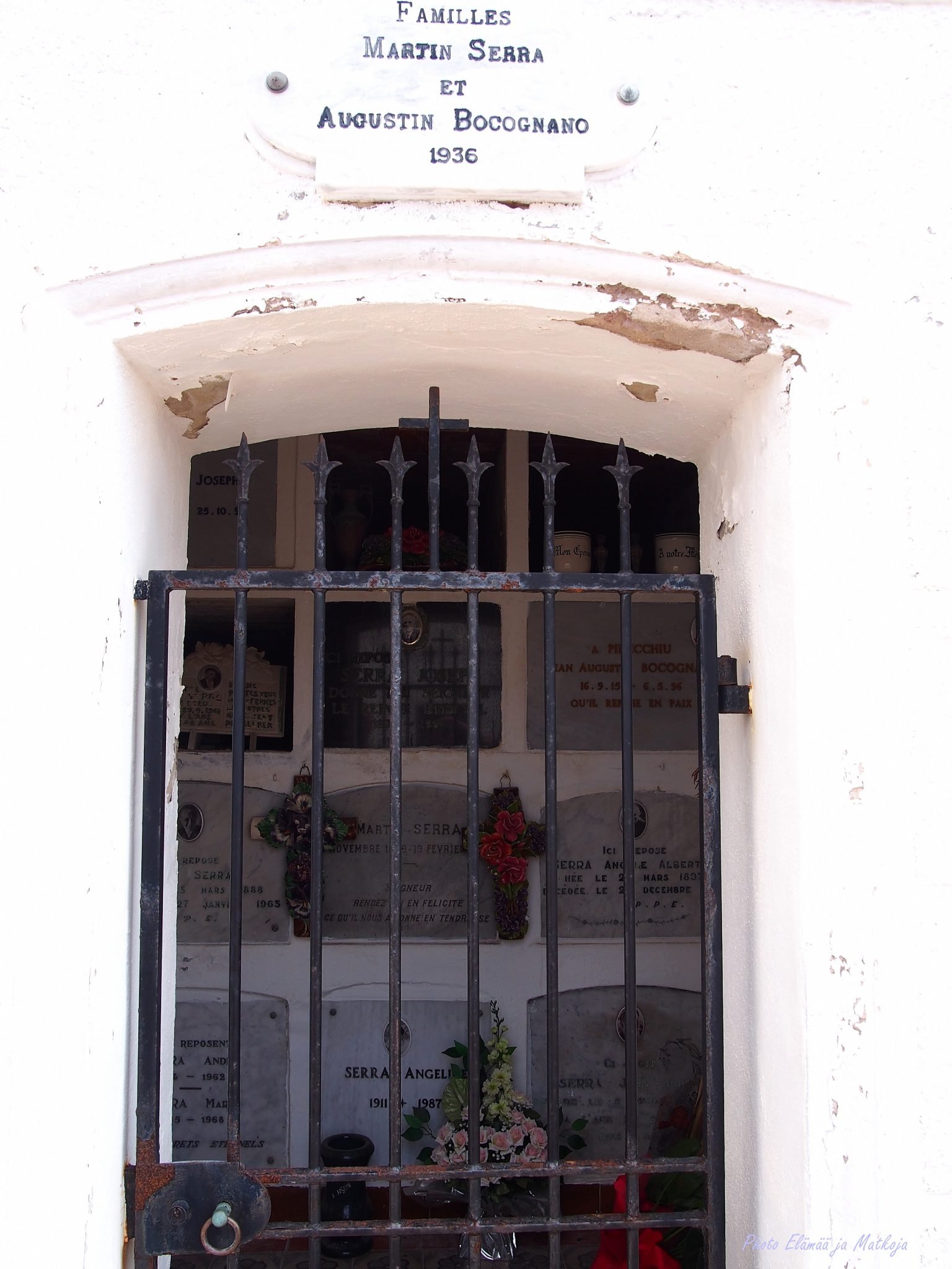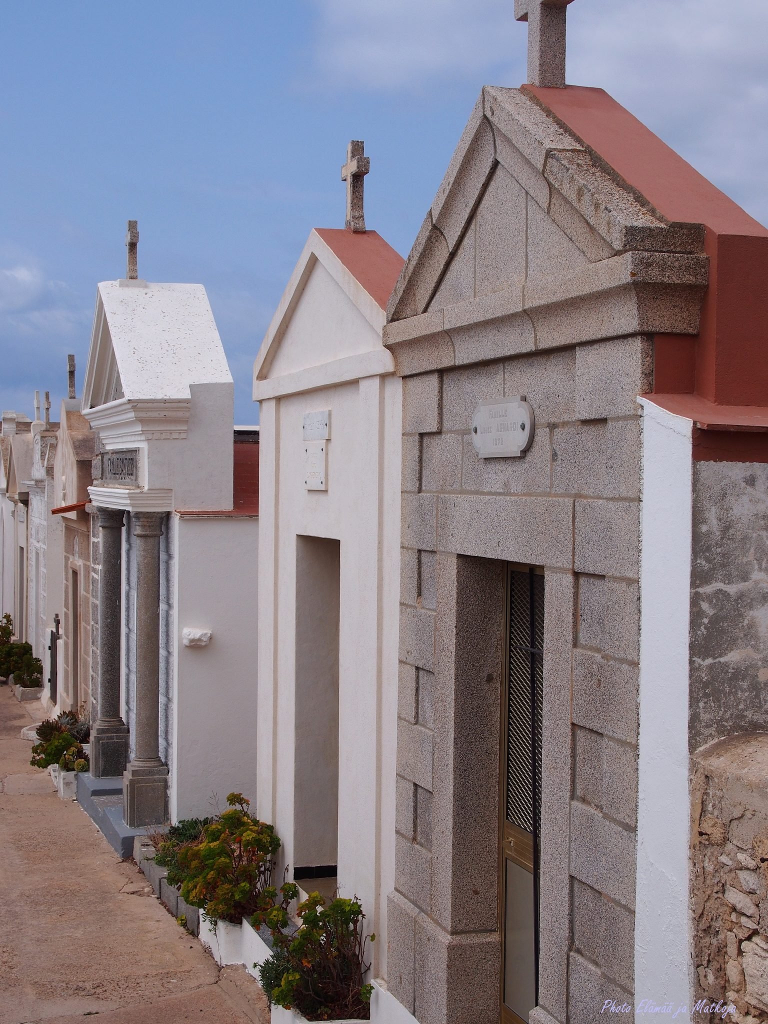 Huomaamme että syrjäinen pysäköintipaikka ei ollutkaan ihan huono juttu, sillä olemme aivan Cimetière Marinin (vapaasti käännettynä meren hautausmaa) liepeillä, jossa perheenjäsenten matka ajasta ikuisuuteen jatkuu yhteisessä viimeisessä leposijassa. Hautausmaa tunnetaan myös nimellä Cimetière marin de Saint-François tai Campu Santu ja tätä sanotaan yhdeksi Välimeren kauneimmista hautausmaista.