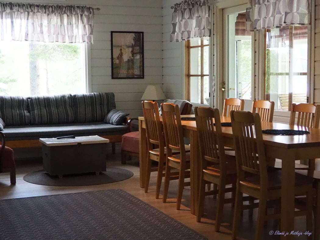 Me majoituimme rannan tuntumassa sijaitsevaan 70 neliöiseen Portinranta mökkiin, jonne myös perheen pieni koira oli tervetullut 20 euron lisämaksua vastaan. Tilavassa mökissä on vuodepaikat kuudelle, ja lisäksi olohuoneen sohvaan voi tarvittaessa sijata vuoteen vielä yhdelle. Avarassa tupakeittiössä on mukavaa viettää aikaa perheen tai ystävien kanssa, ja hyvin varustellusta keittiöstä löytyy kaikki tarvittavat välineet ruuan laittoon sekä ruokailuun. Tilavassa pesuhuoneessa on kaksi suihkua ja sähkölämmitteinen sauna sekä pyykinpesukone ja kuivausrumpu. Wc-tilojen suunnittelussa ei oltu valitettavasti panostettu tilaan ja laskutiloihin, mutta muutoin mökki on toimiva ja varusteltu niin, että pidempikin viipymä sujuu hyvin myös käytännön asioiden puolesta. Mökissä on lisäksi takka, ilmalämpöpumppu sekä wifi, joka toimi hyvin.
